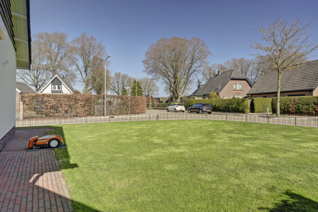 De tuin rondom de woning is fraai aangelegd en biedt een mooie balans tussen groen en bestrating. Aan de voorzijde ligt een ruim gazon, terwijl de achterzijde is ingericht met een terras waar het heerlijk vertoeven is. Het overdekte terras vormt een fijne, beschutte plek om in alle seizoenen van het buitenleven te genieten.