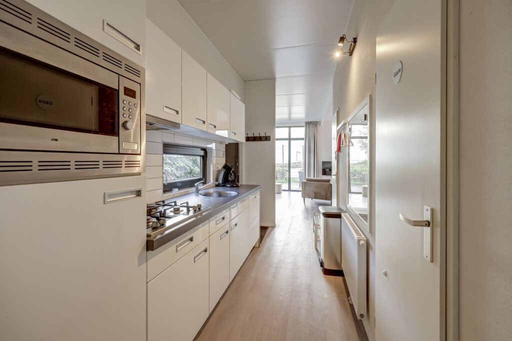 Bij binnenkomst betreed je de woning via de keuken, die centraal in de woning is gesitueerd. Vanuit deze ruimte heb je toegang tot de drie slaapkamers, de badkamer en de woonkamer. De keuken is geplaatst in een rechte opstelling en voorzien van diverse inbouwapparatuur, waaronder een kookplaat, afzuigkap, koelkast en combimagnetron. Daarnaast is er voldoende kastruimte aanwezig en is de afwerking modern en netjes.