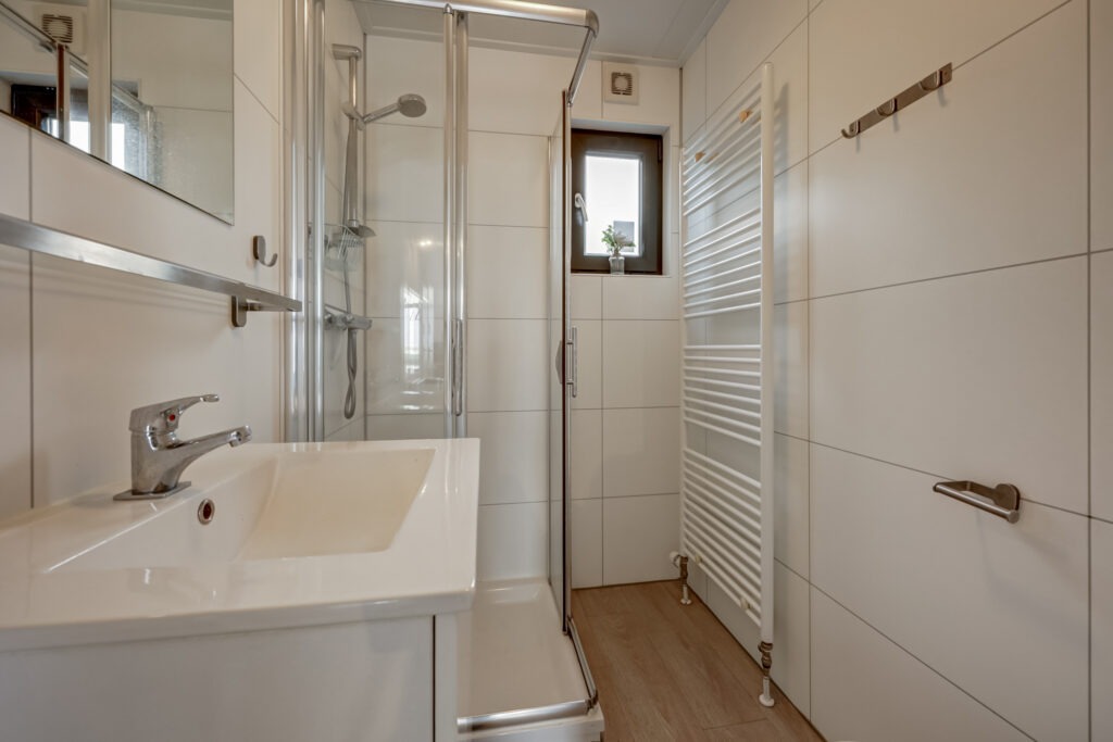 De badkamer is bereikbaar vanuit de hal en is compleet uitgevoerd met een douche, wastafelmeubel en toilet.