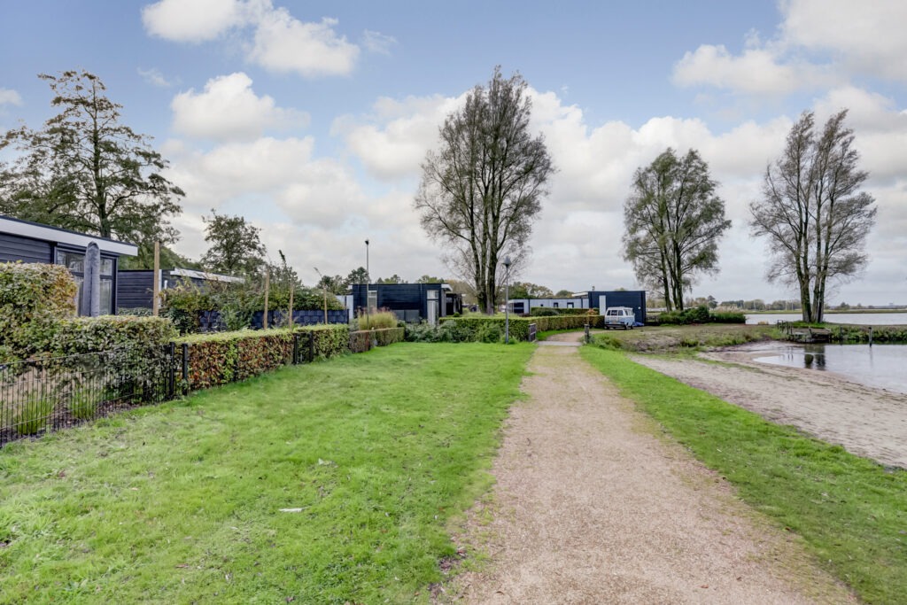 Aan de voorzijde van de woning tref je een verhard terras met plek voor een grote eettafel en nog een plek om een loungeset te plaatsen. Vanaf het terras kijk je prachtig over het water heen en kan je ’s avonds genieten van de zonsondergang. De woning is volledig omheind en aan de voorzijde heb je via een eigen deur toegang tot het strand die tot het park behoort.