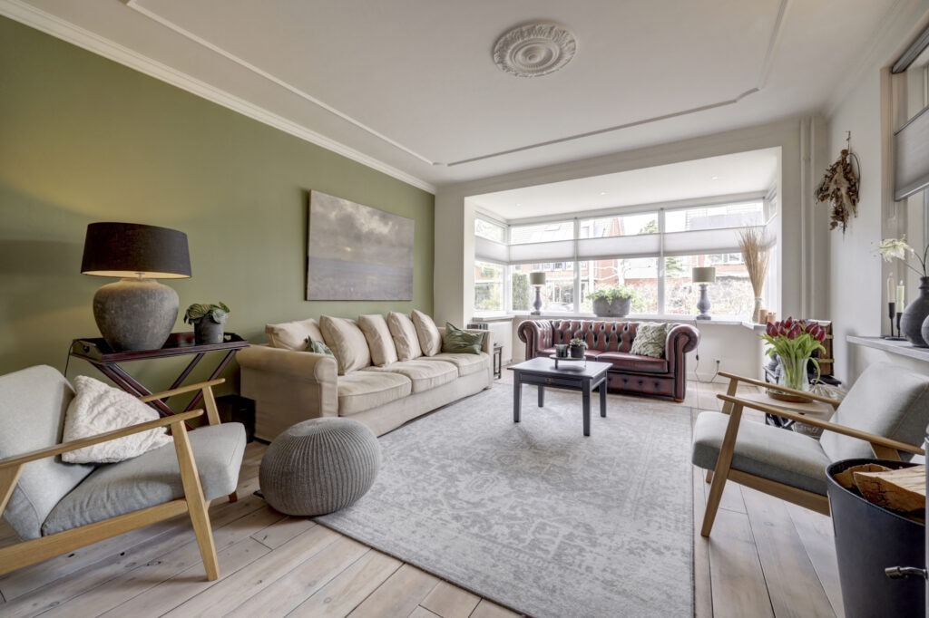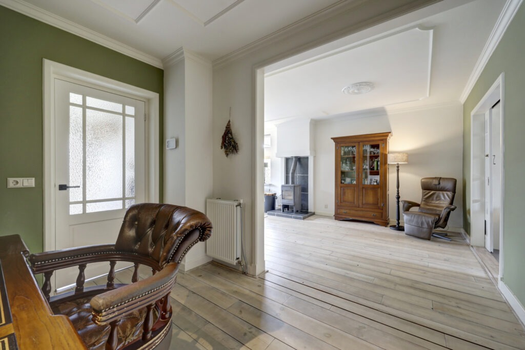 Bij binnenkomst ervaar je direct de prettige sfeer en royale opzet van deze woning. De hal geeft toegang naar het toilet, meterkast met kelderkast, de trapopgang naar boven en de woonkamer. De ruime woonkamer is heerlijk licht en heeft dankzij de erker aan de voorzijde een extra charmante uitstraling. De houten vloeren versterken het warme karakter van het geheel en via de kamer ensuite-deuren sta je in verbinding met de keuken, waardoor de ruimtes mooi in elkaar overlopen en toch ieder een eigen functie behouden.