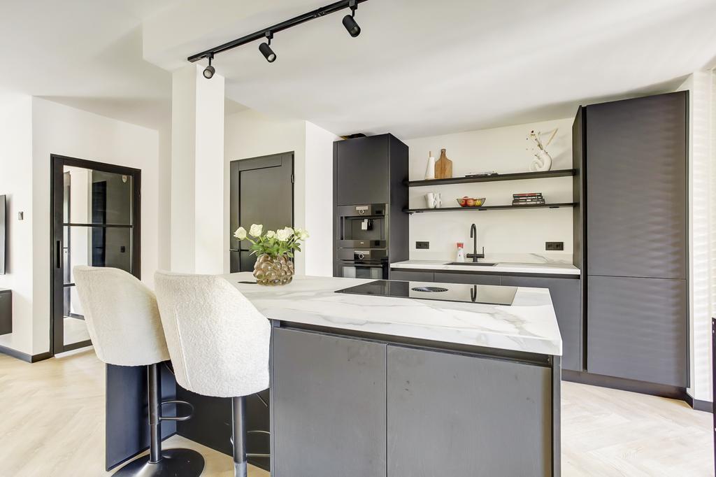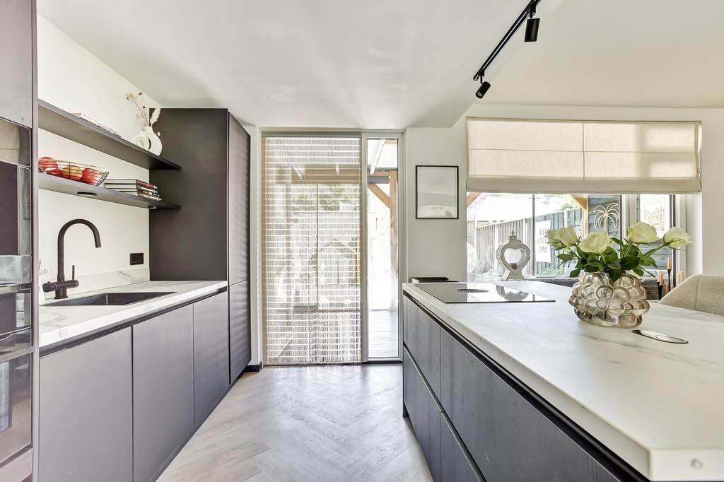 Loop je door, dan kom je in de open keuken met eetgedeelte . De keuken is splinternieuw (2024) en praktisch. Denk aan een kookeiland met ingebouwde afzuiging, extra opbergruimte en een bar waar je lekker aan kunt zitten. Verder vind je hier een combi-oven, ingebouwd koffieapparaat en een koel-vriescombi. Alles strak en modern afgewerkt.