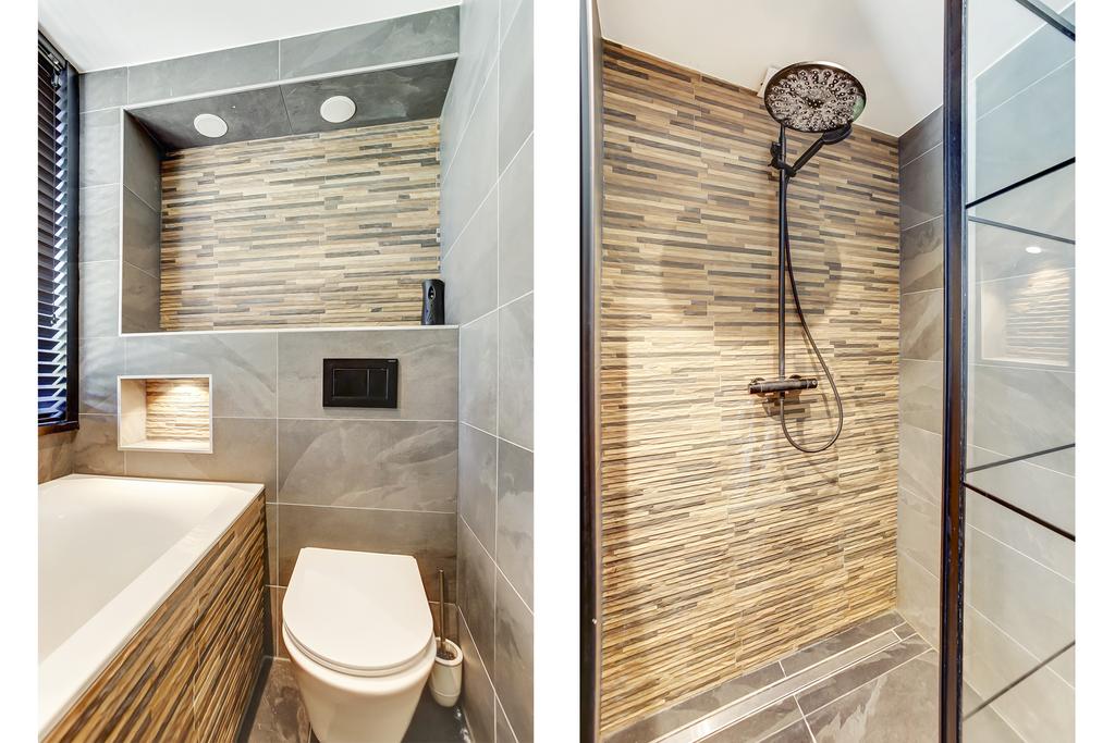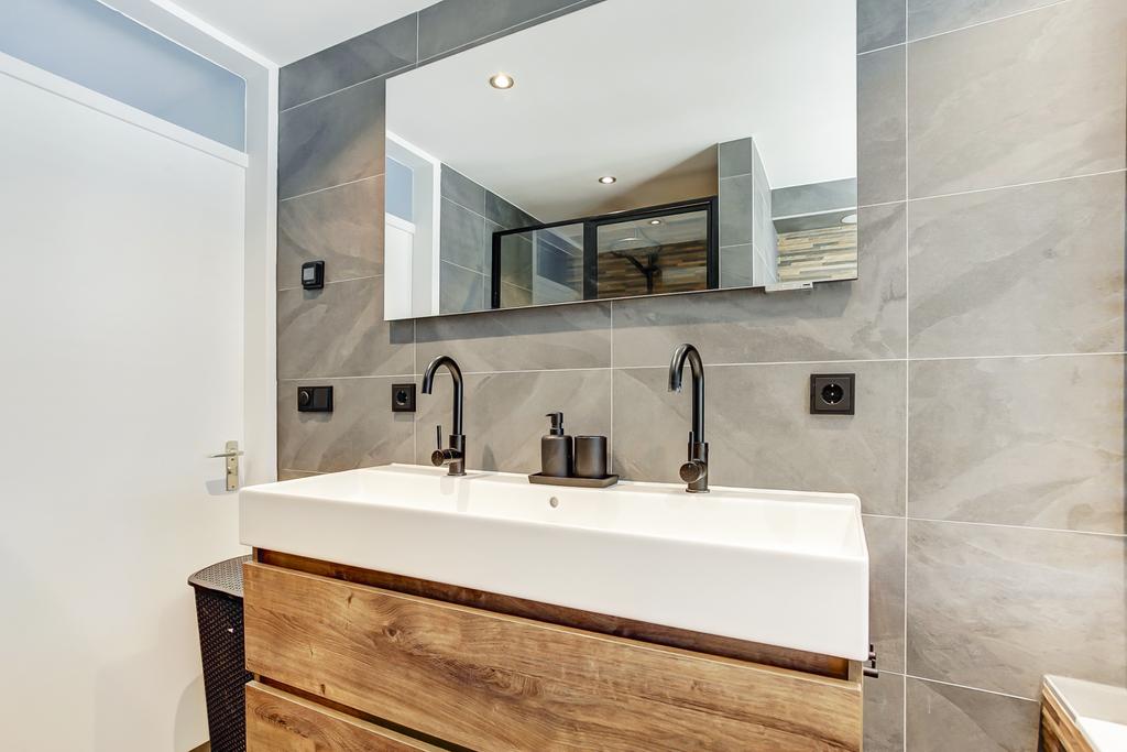 De badkamer is in 2021 volledig vernieuwd en dat zie je. Een moderne en rustige uitstraling door de combinatie van grote, neutrale tegels en houtaccenten in het wastafelmeubel. Je vindt hier een inloopdouche, een ligbad, een dubbele wastafel, toilet en een radiator. Alles strak en praktisch ingedeeld.