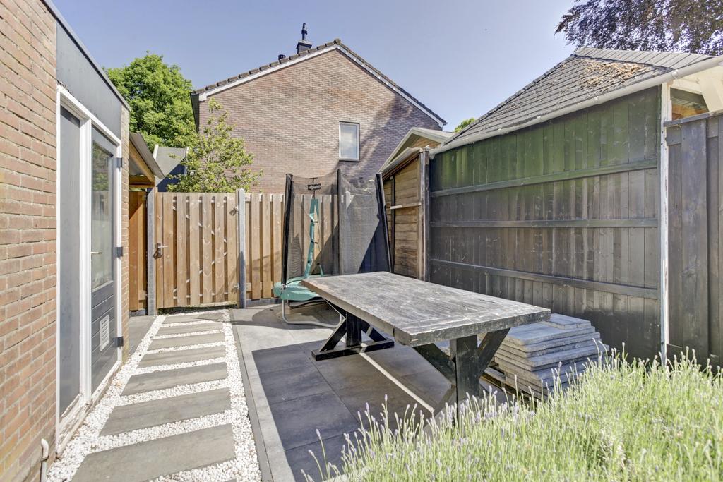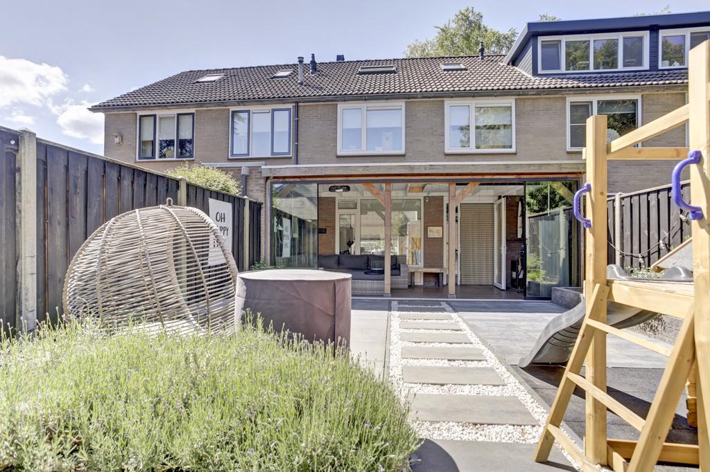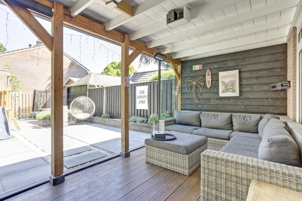 De voortuin is strak aangelegd met siergrind en een pad naar de voordeur wat een verzorgde uitstraling geeft. De achtertuin is echt een fijne plek om tot rust te komen. Dankzij de aangebouwde overkapping met heater en glazen schuifpui zit je hier het hele jaar door heerlijk, of het nou zomer of winter is. De tuin ligt gunstig op het oosten en deels op het zuiden, dus je pakt lekker veel zon mee.
