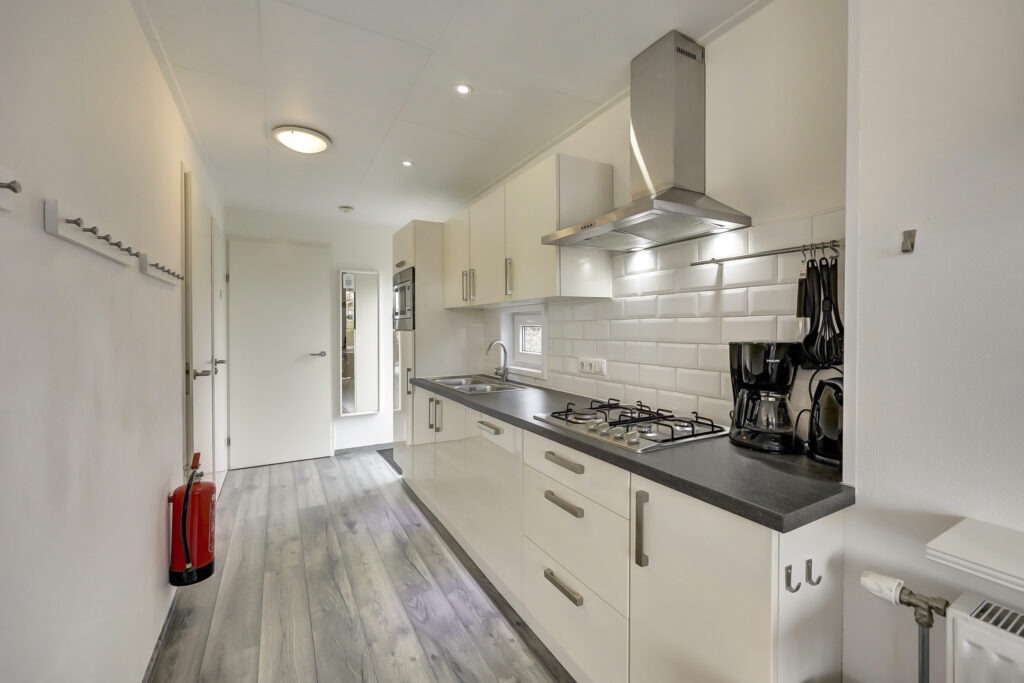 De keuken is uitgevoerd in een rechte opstelling en voorzien van moderne inbouwapparatuur zoals een gaskookplaat, combimagnetron, vaatwasser, koelkast en een roestvrijstalen afzuigkap. Er is bovendien volop kastruimte aanwezig.