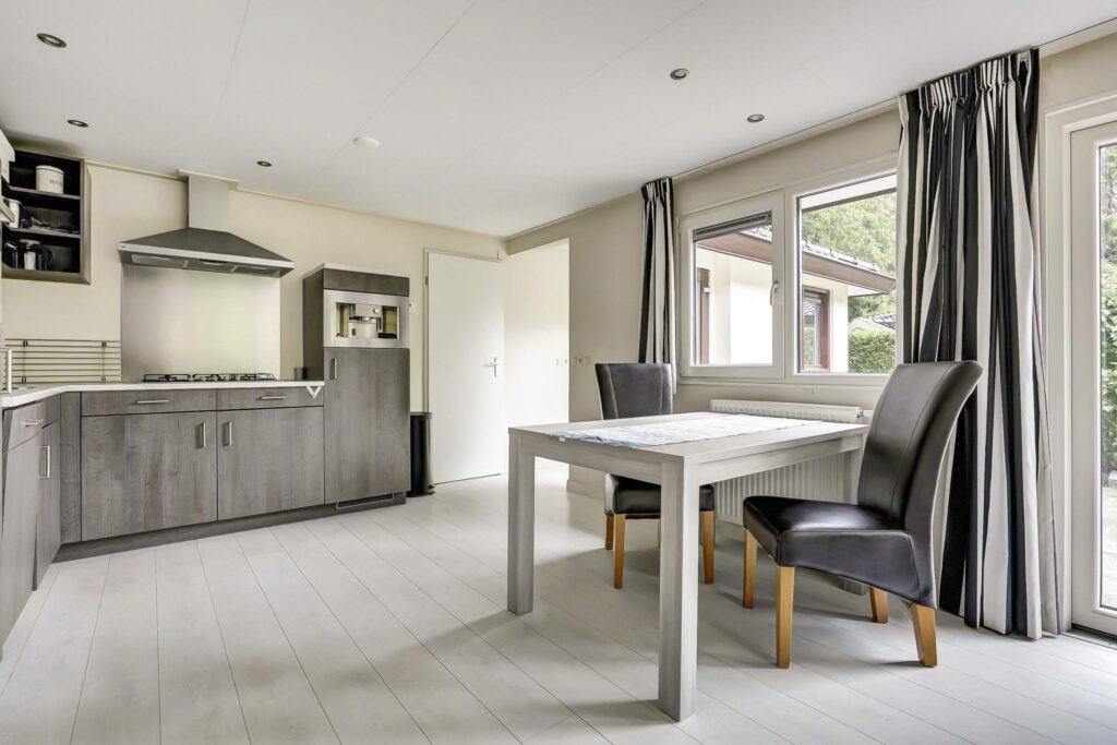 De woonkamer is ruim en licht dankzij de grote ramen en de speelse erker aan de voorzijde. De openslaande deuren bieden directe toegang tot de tuin. Er is voldoende ruimte voor zowel een comfortabele zithoek als een gezellige eethoek. De keuken, grenzend aan de woonkamer, is praktisch ingedeeld en uitgerust met een kookplaat, oven, afzuigkap, koelkast en vaatwasser.