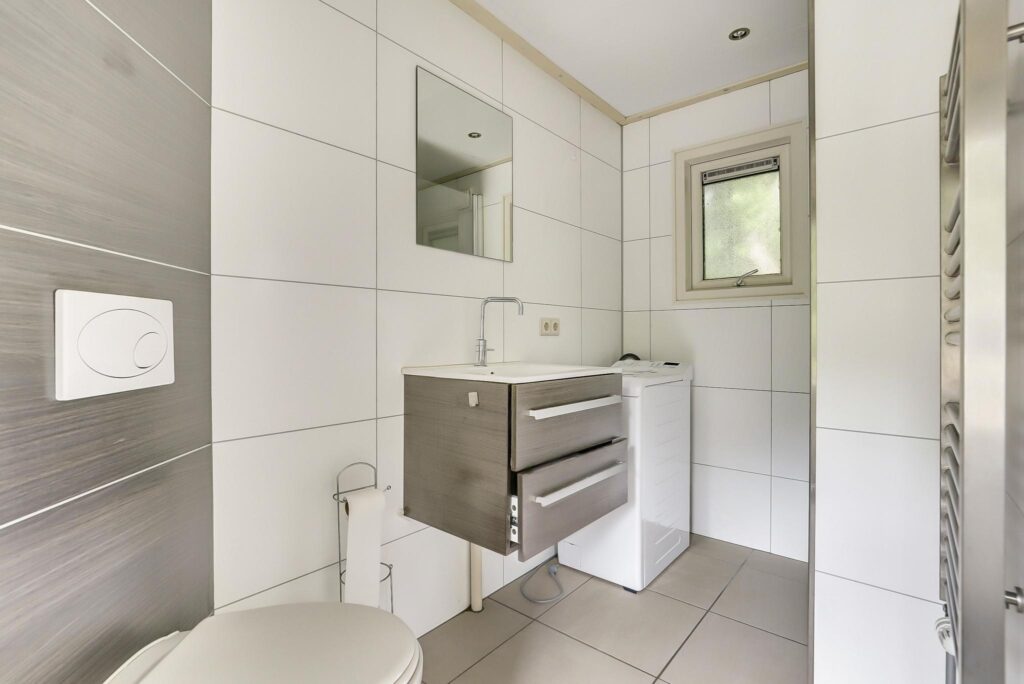 De badkamer is voorzien van een douche, wastafel en toilet. Daarnaast tref je ook de wasmachine aansluiting in de badkamer.